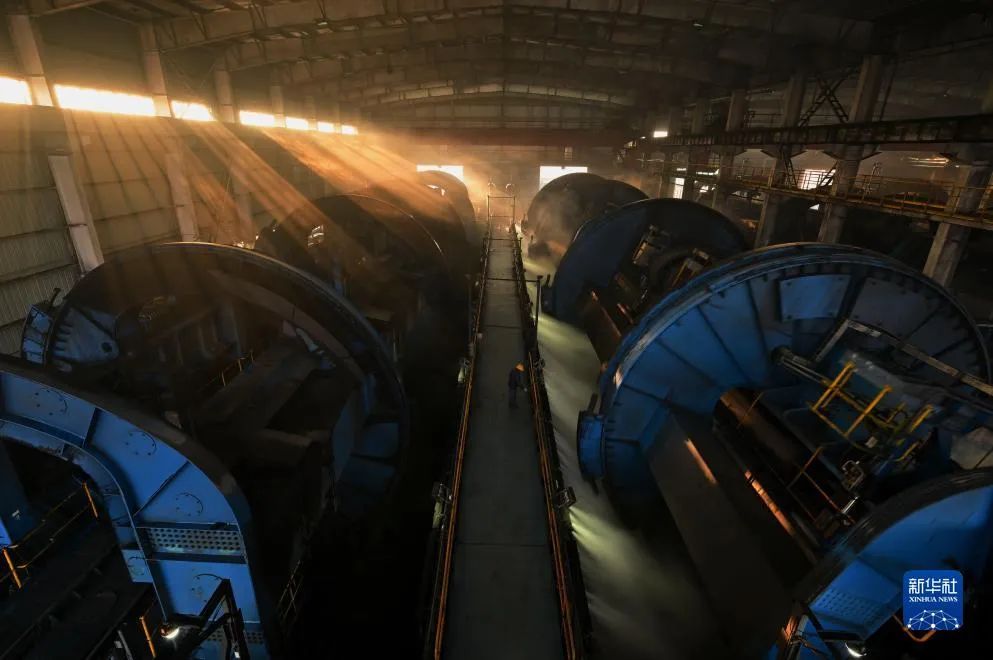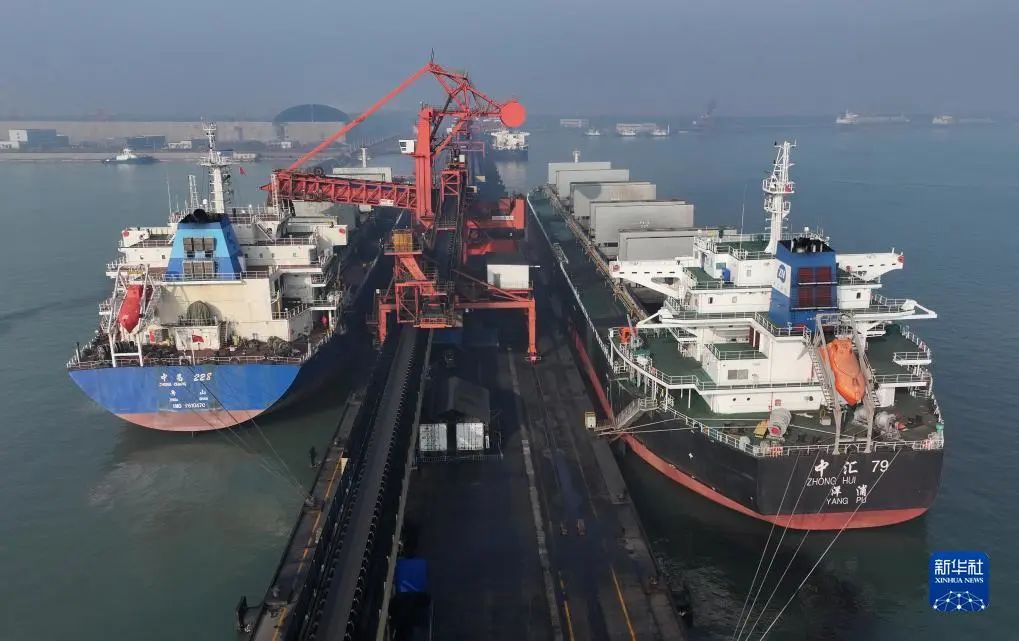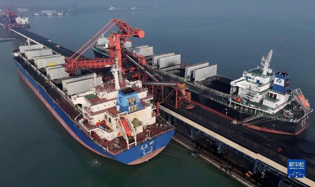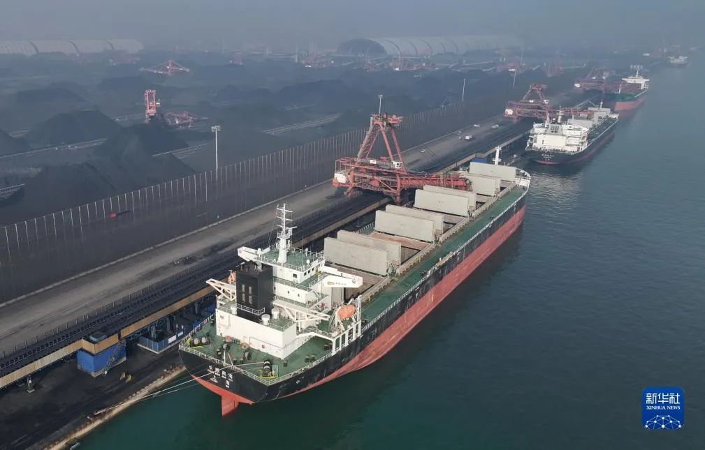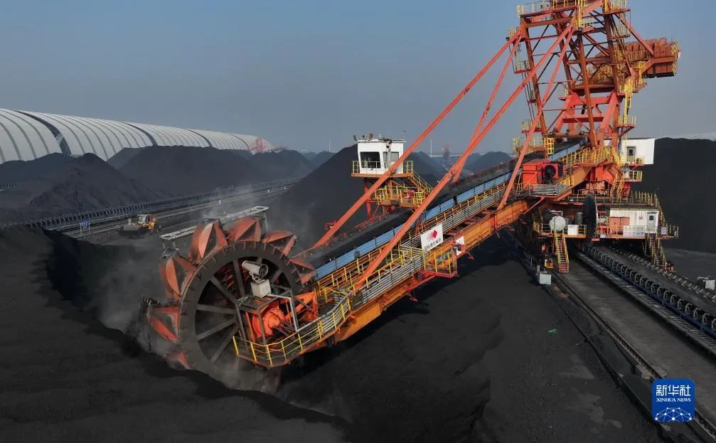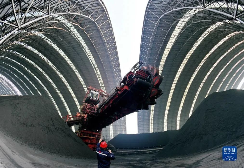 12月5日,工人在唐山港曹妃甸港區(qū)國(guó)投曹妃甸港口有限公司煤炭堆場(chǎng)操作堆料設(shè)備作業(yè)(無(wú)人機(jī)照片)。 來(lái)源:新華社
