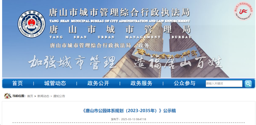 唐山市城市管理局發(fā)布《唐山市公園體系規(guī)劃》計(jì)劃在路南區(qū)、路北區(qū)、高新技術(shù)開發(fā)區(qū)、豐南區(qū)、開平區(qū)5 個(gè)區(qū)城區(qū)部分新建一批綜合公園 唐山市公園體系規(guī)劃(2023-2035年)公示稿